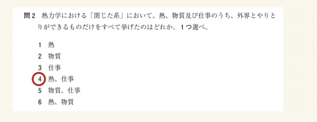 熱力学における「閉じた系」において、熱、物質及び仕事のうち、外界とやりとりができるものだけをすべて挙げたのはどれか。1つ選べ。