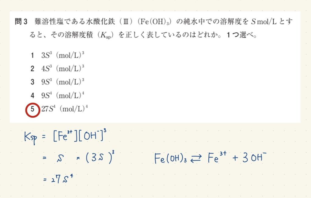 難溶性塩である水酸化鉄(Ⅲ)(Fe(OH)3)の純水中での溶解度をSmol/Lとすると、その溶解度積(Ksp)を正しく表しているのはどれか。1つ選べ。