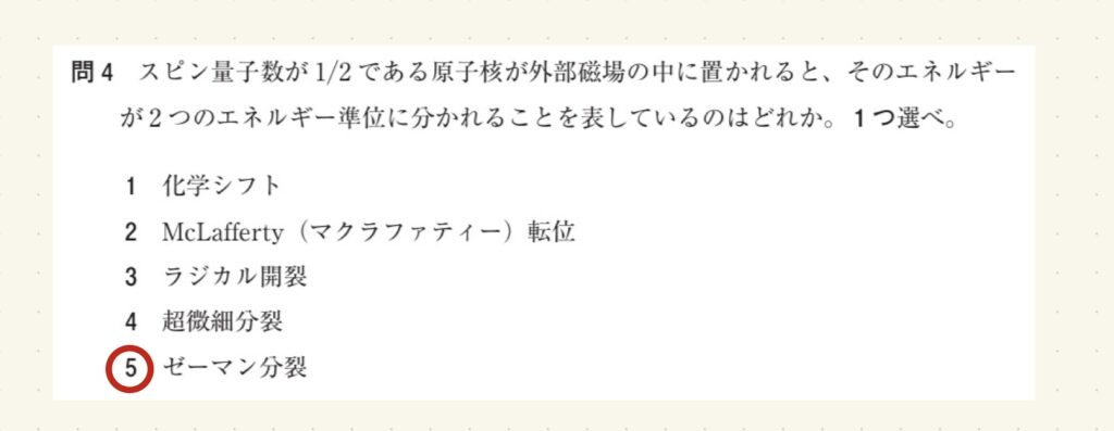 スピン量子数が1/2である原子核が外部磁場の中に置かれると、そのエネルギーが2つのエネルギー準位に分かれることを表しているのはどれか。1つ選べ。