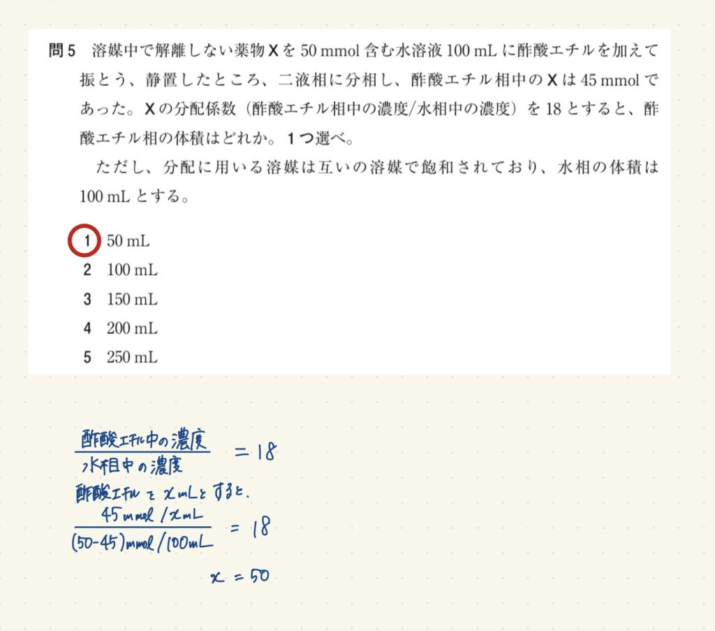 溶媒中で解離しない薬物Xを 50mmol含む水溶液 100mLに酢酸エチルを加えて振とう、静置したところ、二液相に分相し、酢酸エチル相中のXは 45mmolであった。Xの分配係数(酢酸エチル相中の濃度/水相中の濃度)を18とすると、酢酸エチル相の体積はどれか。1つ選べ。