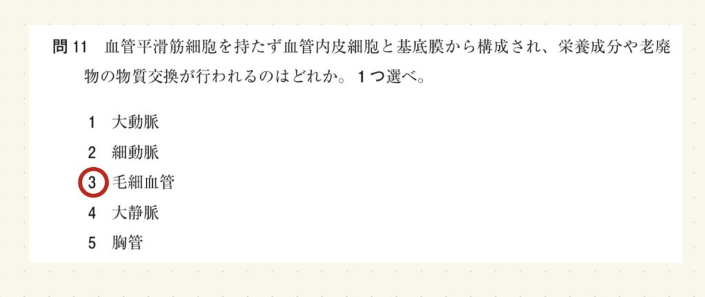 血管平滑筋細胞を持たず血管内皮細胞と基底膜から構成され、栄養成分や老廃物の物質交換が行われるのはどれか。1つ選べ。