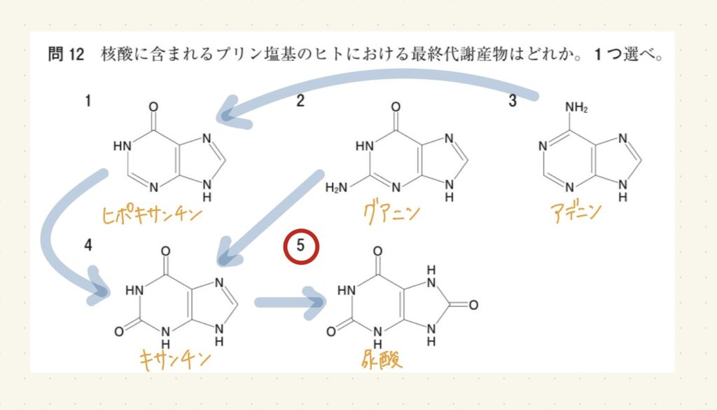 核酸に含まれるプリン塩基のヒトにおける最終代謝産物はどれか。1つ選べ。