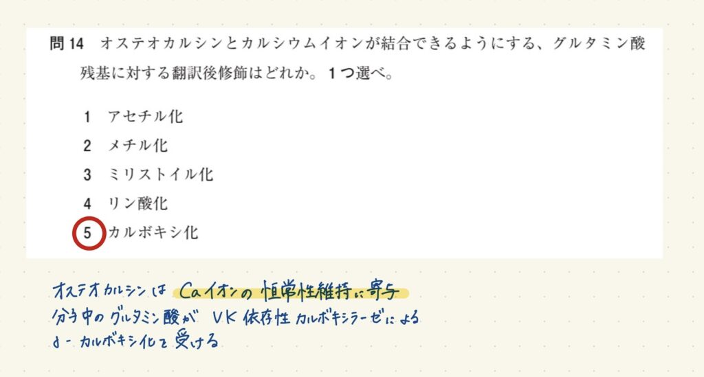 オステオカルシンとカルシウムイオンが結合できるようにする、グルタミン酸残基に対する翻訳後修飾はどれか。1つ選べ。