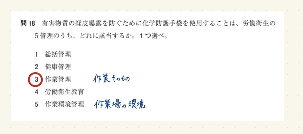 有害物質の経皮曝露を防ぐために化学防護手袋を使用することは、労働衛生の5管理のうち、どれに該当するか。1つ選べ。