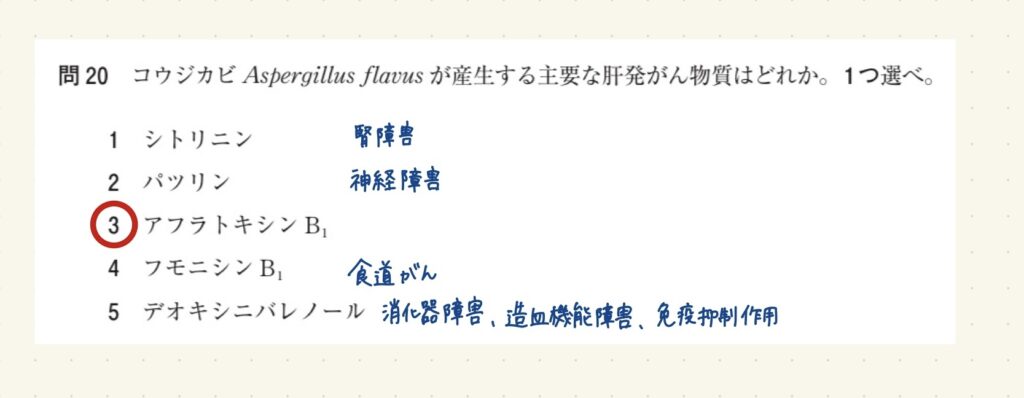 コウジカビAspergillus flavusが産生する主要な肝発がん物質はどれか。1つ選べ。