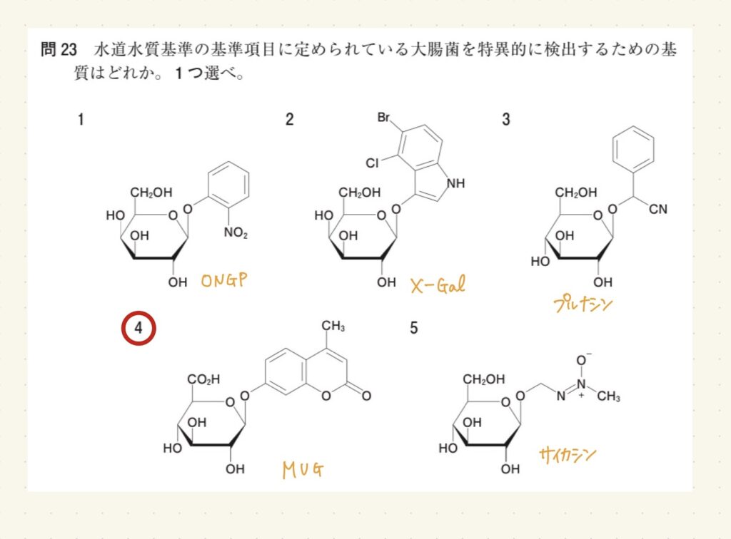 水道水質基準の基準項目に定められている大腸菌を特異的に検出するための基質はどれか。1つ選べ。
