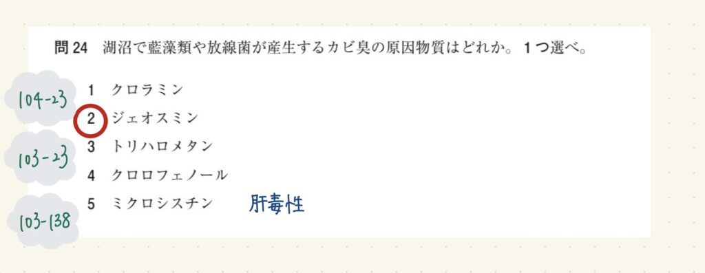 湖沼で藍藻類や放線菌が産生するカビ臭の原因物質はどれか。1つ選べ。