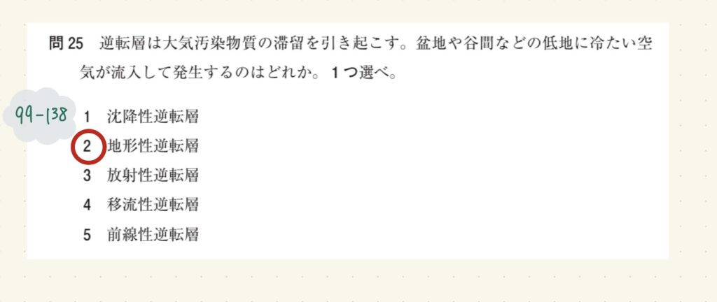 逆転層は大気汚染物質の滞留を引き起こす。盆地や谷間などの低地に冷たい空気が流入して発生するのはどれか。1つ選べ。